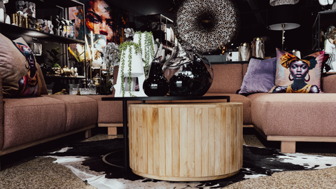 Anchoring the space, the circular wooden coffee table introduces natural texture and visual grounding, its rich linear pattern complementing the plush upholstery without overpowering it. Delicate glass accents and subtle greenery add depth and freshness, their light, airy forms balancing the bold colour of the couch. Together, the interplay of soft curves, tactile fabrics, and warm wood creates a space that is harmonious, visually powerful, and effortlessly luxurious - a setting that draws the eye and encourages lingering.
