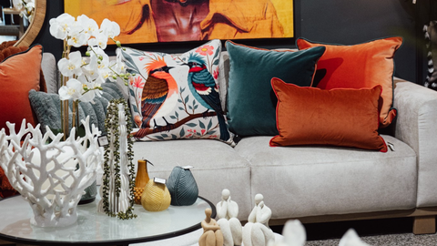 Unique details - like the twin-bird scatter with its harmonious blend of blue and orange - add character and charm, while the white glass coffee table and subtle décor pieces unify the composition. The interplay of bold colour, refined neutrals, and layered textures creates a lounge that feels dynamic, curated, and effortlessly sophisticated - a space that balances energy with elegance.
