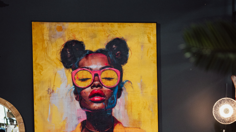 A striking artwork anchors this space, its retro-inspired yellow tones and centered figure commanding attention while setting the mood for the room. The soft light grey couch provides a calm, elegant foundation, allowing the vibrant burnt orange and dark blue accents to shine without overwhelming the scene.