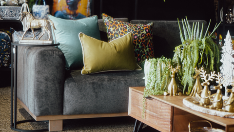 Subtle touches of green and serene blues add calm and continuity, while the strategic pop of golden-yellow brings energy and draws the eye. The natural warmth of the wooden coffee table grounds the space, and the greenery introduces life and softness, creating an inviting rhythm across the room. Layered textures - the softness of the throws, the tactile weave of the scatters, and the sleek lines of the table - enhance depth, making the space feel both dynamic and elegantly cohesive.